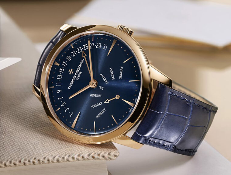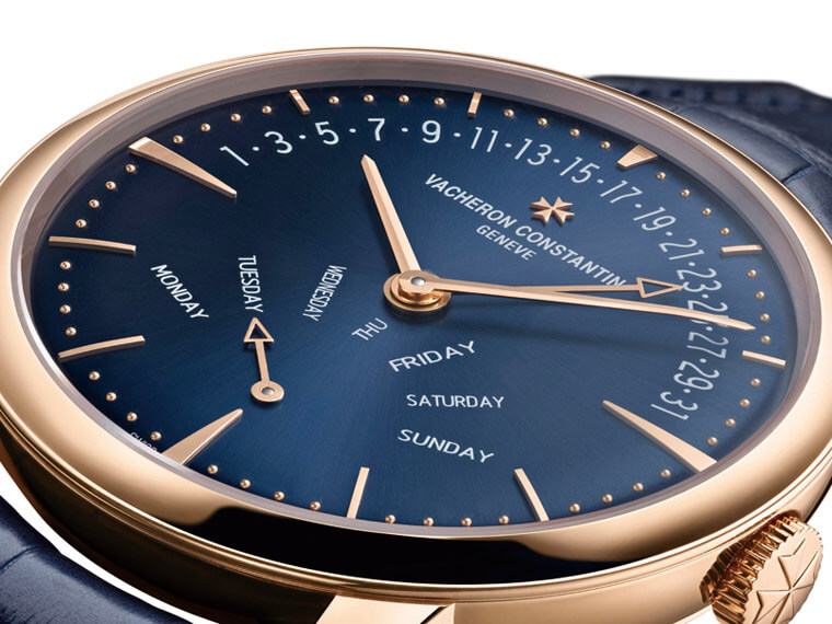 一般碰到类似的逆跳星期在标示周间七日的时候通常会只取头字,充其量是採用三个字母的缩写,总之就是儘量抑制这些文字标示的面积,让它们在面盘上不要太抢戏,然而VC这款反其道而行,将完整的星期文字当成一种设计元素,由它们构成了表面下半部的主视觉,这样的做法让表款乍看之下没那麼古典,甚至有点不像VC(其实只要比较后出的Patrimony月相逆跳日期就能感觉出来,这款将逆跳星期换成了月相以后看起来就更接近我们熟悉的VC了)。当然这中间无关优劣,它只是展现出了品牌的另一面性格而已,偏爱哪一种完全是个人口味差异。