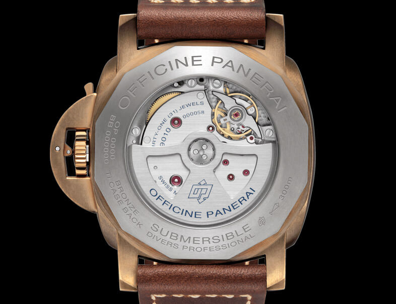 三代青铜其实和前两代有一些差异包括表壳的整体厚度变得更为轻薄,表壳厚度从前两代的17.5mm,到三代由于改搭载品牌较晚近推出的P.9010自动上链机芯,而使得表壳厚度整体少了2mm左右,因为P.9010机芯仅有6mm,和初代与二代的机芯整整差了近2mm左右,不过表径上仍然延续了前作的大表径魅力,一样是沛纳海正宗的47mm,因此整体手感上并不会差很多。机芯的改变到了PAM00968身上依旧沿用P.9010,这枚机芯13¾法分、厚6.0mm、200枚零件的规格,加上28,800vph震频,动力储存还是有三日链的充实感,成为佩戴者可以安心的后盾。