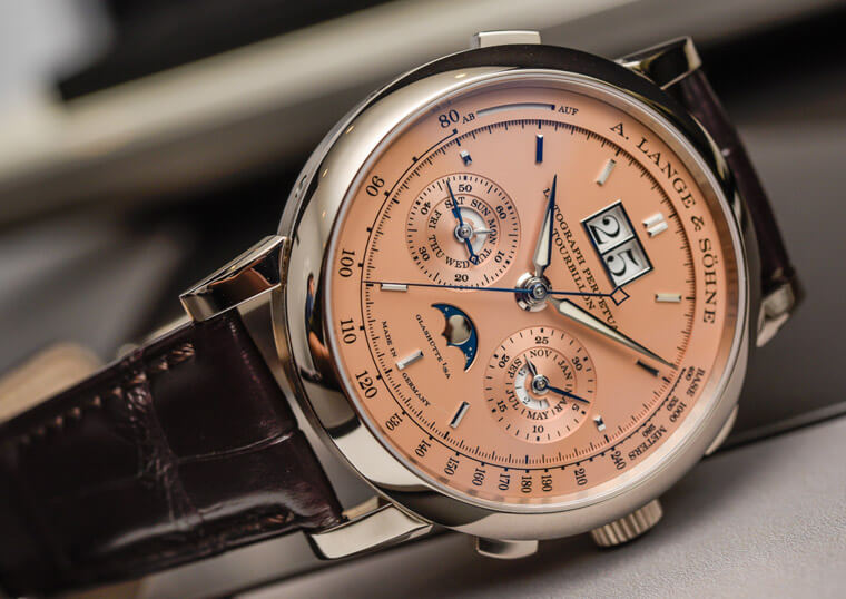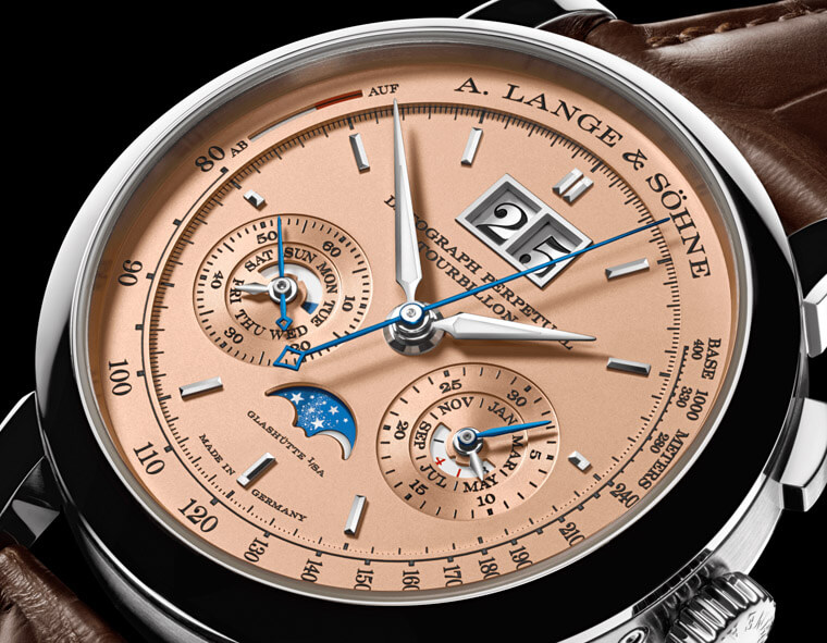 这款Datograph家族中功能最复杂的成员在2019年再次推出新改款,新款不只更换了表壳材质,就连面盘顏色也推出朗格少见的设计,塑造出与前作低调黑色截然不同的个性。