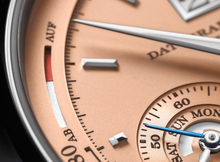Datograph Perpetual Tourbillon改款以白金搭配玫瑰金色调,比起前作的黑面,玫瑰金色面盘则多了点复古优雅的情怀。而面盘布局亦维持德系经典简约风格。两个计时盘结合日期及星期显示,形成「双眼」设计,俐落清晰。面盘12点钟位置则配备朗格手表之灵魂——大日期显示,而6点钟位置则搭载月相显示,赋予手表一种浪漫诗意。