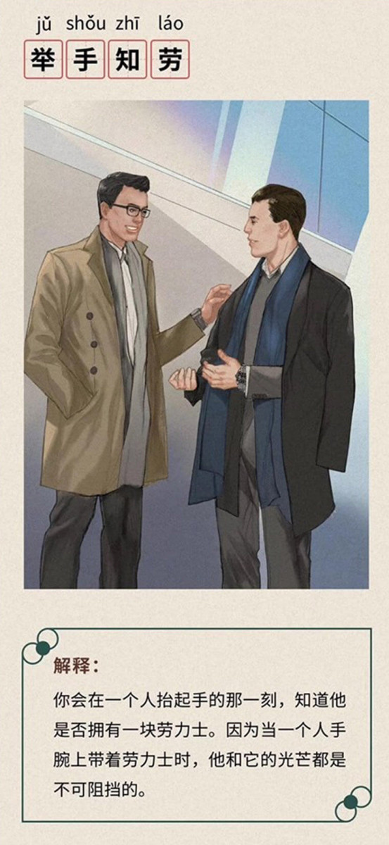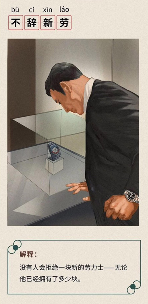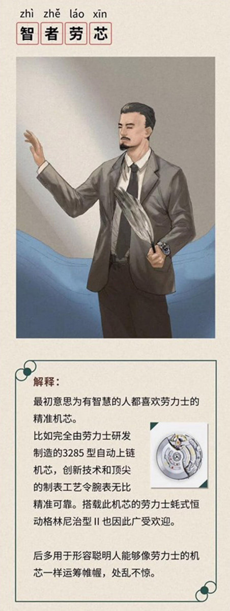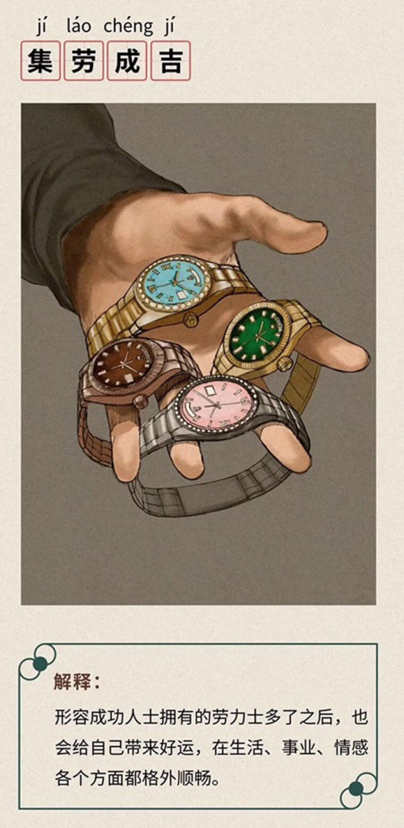 不过中文的世界如此博大精深,真的要Kuso可以用来描述劳力士的成语也绝对不会只有一劳永逸可讲,爱表咖社团有表友分享了对岸表友所精心设计的劳力士相关成语集,裡面不只有成语、拼音、图片,也包含了编者精闢的解释,一连串看下来让人看得很过癮,也不得不佩服原作者的创意。