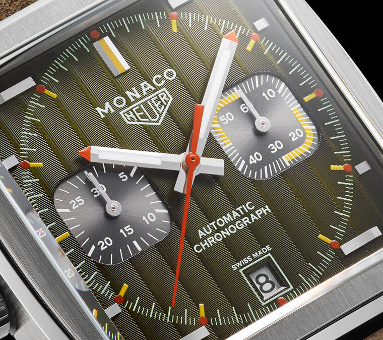 Monaco是最早搭载Calibre 11的表款——甚至可以说它是专为Cal. 11而生的;1969年距今正好50年,因此豪雅2019年将为此推出5款特殊版的Monaco,每款分别代表了这50年当中的10年,透过如此点题又热闹的方式来纪念此事。在摩纳哥分站这个对此一系列别具意义的所在发表的第一款代表的是1969~1979,也就等同是整个1970年代;作为纪念套表的第一款,对应的又是最具有Monaco原生精神的1970年代,一般我们都假设品牌可能会直接复刻初代表款、採用最经典的蓝色或是Gulf Color,不过也许是因为这些配色过去豪雅已经出过太多次了,甚至在现行产品中就两种都有,所以这次他们选择了一个有点令人意外、但同样充满了1970年代风格的组合。