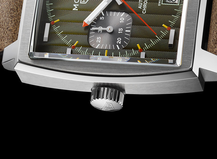 表冠和按把的配置自然採用了Cal. 11最具象徵性的左冠设计,据说当初之所以将表冠改到左边是为了强调它是自动上链的,由于毋需每天手动上链所以移到了不常用的左侧,说来是一种行销手法。Monaco到了现代有发展出几种不同的壳型,像是V4的表镜就立体地从左右两边一路包到斜侧面;这款祖述1970年代的复古款式採用的自然是原始造型,之后这个企划将怎麼诠释接下来的不同年代也着实令人期待。