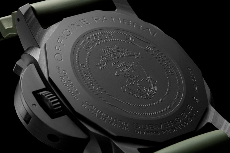 这个部队的队员精通不同的战技,不仅要会潜水、甚至还必须达到饱和潜水的境界,有时还必须替义大利进行水下石油样本的採集行动,在漆黑、安静的深海中完成任务。他们不只能在水下作战,搭乘直升机利用快速游绳迅速进行登陆已进行海上反恐也是他们擅长的领域,可以说是义大利军队中的菁英份子。在COMSUBIN的Logo中可以看到一只嘴中含着剑的鱷鱼,另外鱷鱼下方还有一个船锚,鱷鱼展现了特种部队水陆两栖的能力,而船锚也是与航海有关的元素,这个图案反应在PAM00961仅33只的限量数显得特别珍贵。