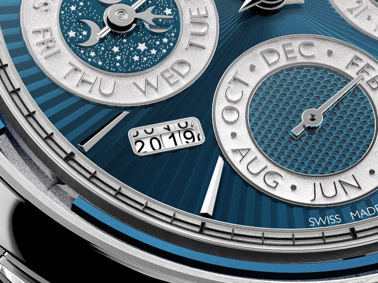 万年历功能主要分布于面盘上的三枚小表盘身上,积家另于7~8点方向设置了年份视窗取代万年历表常见的闰年显示,此外9点位置的星期盘也融合了月相显示锦上添花。