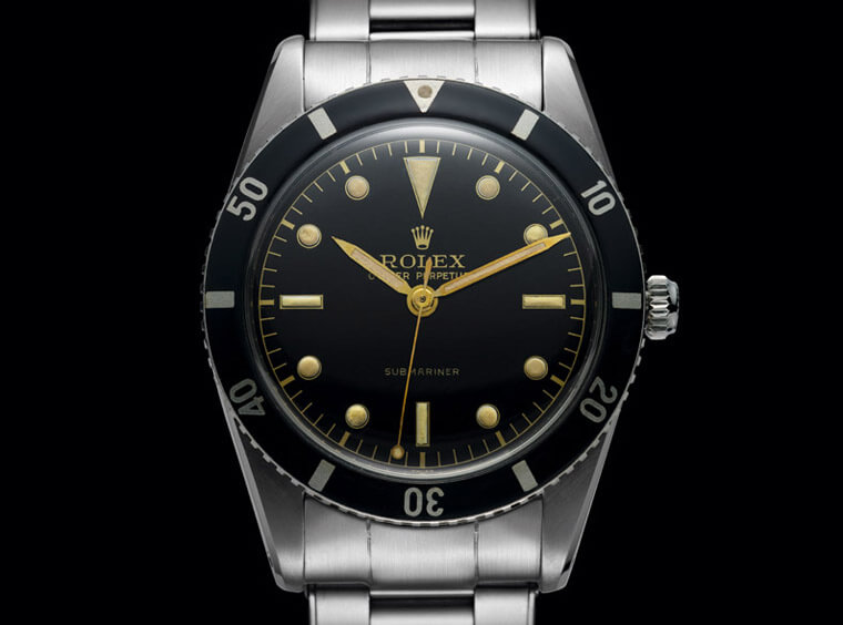 ▲1953年劳力士推出的首款Oyster Perpetual Submariner,型号为6204,面盘6点钟方向印有明显的”Submariner”字样。
