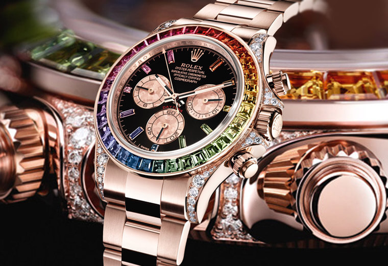 劳力士的Daytona原本就是品牌旗下的畅销人气款,例如前不久曾有日媒做过统计,在当地市场前十大超定价手表中,Daytona就分别佔了第二名和第四名的位置,在我们印象中大家疯抢的Daytona差不多就是116520或116500LN等这些不锈钢材质的耐操实戴款,由于它们现在在市场太火热,往往想要入手都超伤荷包或是要很有耐心的等,那麼你可能会想说如果预算够的话不如直上贵金属的Daytona好了,虽然它们的定价更高(大概接近百万甚至破百万台币),但是相对来说应该也比较不容易让大家想要抢着入手,不过有一款2018年才发表的贵金属Daytona倒是颠覆这种印象,它就是Daytona 116595RBOW,是的没错,有相彩色宝石和钻石的彩虹圈Daytona。