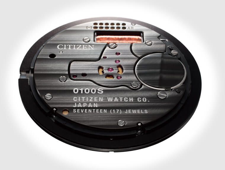 除了精度之外0100对指针运行的动作也很要求。为了避免指针在受到冲击时被震离了定位,机芯将马达转子的扭力提升了50%,并且在侦测到冲击时会自动锁死转子,这些都强化了机芯的耐震能力,不过相对地也增加了电力的消耗。为了替Eco-Drive的工作釜底抽薪,0100装载的表款採用了较窄的表圈,儘可能扩大表面的受光面积,同时机芯轮系中的三、四、五番车以及转子都使用了宝石轴承,由此减少轮系运作的摩擦阻力也有助于节电。