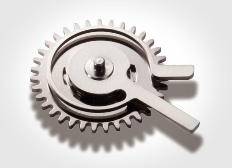 高精度石英机芯往往有意突显秒针能正确地指在刻度上,为此0100将三番车连上了一颗三番回复轮,利用回复轮裡的弹力弓让轮系中轮齿的间隙能维持在紧绷的状态,使走针更确实;类似的装置在GS的9F机芯中也有,所差者在于9F是用游丝取代弹力弓。这裡弹力弓的造型相当复杂,CITIZEN是利用LIGA的微机电技术加工而成,LIGA的特长在于能够做出形状特殊和高精度的零件,因此0100除了这裡的弹力弓之外其他基本轮系的成型也都採用了LIGA。