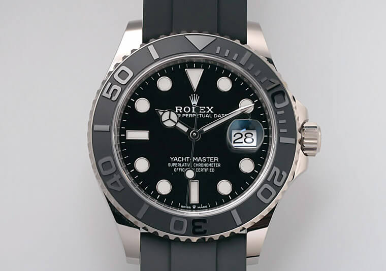 ▲Yacht-Master 42为黑色面盘搭配雾面黑色陶瓷表圈,面盘的时标比例略微放大,同时6点方向的"YACHT-MASTER"字样也一併改为白色。