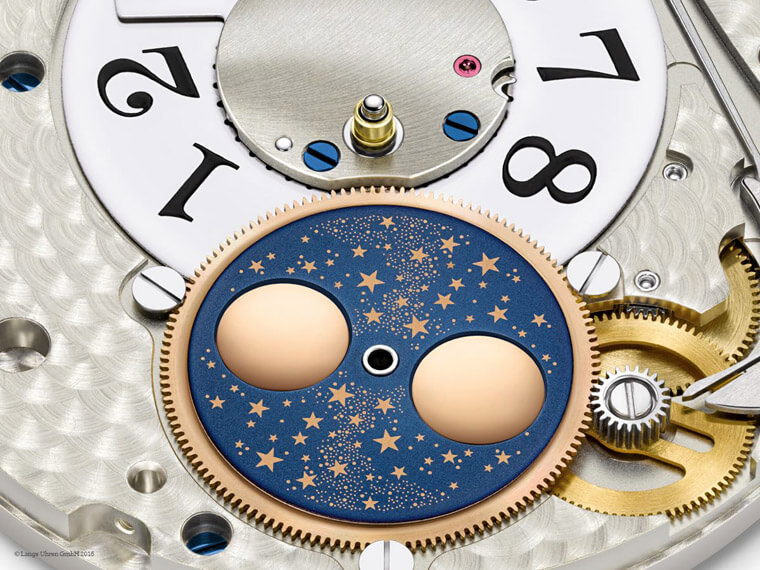 SAXONIA系列的诞生是朗格为了要向品牌发源地致敬而衍生的创意,它与LANGE 1皆为品牌1994年复出表坛的元老级腕表系列之一,外型特徵如纤细的棒状时标、中轴指针显示以及围绕面盘外缘的分钟刻度等等。SAXONIA MOON PHASE传承了系列多数的造型特徵,不过与系列其他二针或小三针基本款有些不同的地方在于,SAXONIA MOON PHASE由于大日期窗设在12点方向,因此同样位于该处的 “A. LANGE & SÖHNE”字样呈水平排列(其他无日期二、三针款式的品牌字样则是呈弧形排列),至于表款的月相盘则是设在6点方向与大日期窗上下对称,小秒盘与月相盘同轴并列,因此可见月相盘周围还有辅助判读小秒的60格刻度。月相盘身为腕表视觉的焦点,除了金质月亮被拋光的金光闪耀,深蓝色月相盘上还额外点缀大大小小的金色星星(总数为852颗),打造宛如星河的意象,佩戴者除了可以藉此观赏到月亮的阴晴圆缺,在方寸空间中体现的星空世界也充满了醉人诗意。