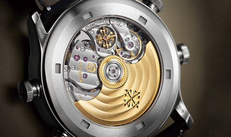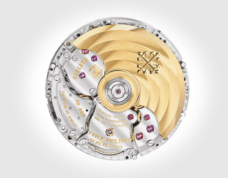 ▲机芯导入了2019年5212周历表搭载的新版324机芯所使用的自动轮,或许未来这会成为PP全辐自动盘的标准规格。