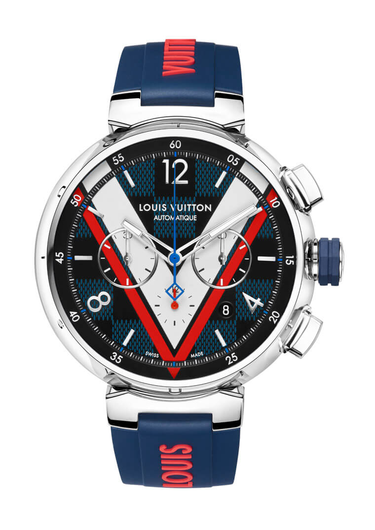 路易威登的制表有愈来愈深入且专业的倾向,然而回到日常,像这样实戴的计时款式相对还是品牌比较主力的产品,计时款市面上有百百种,选择路易威登应该会有很大原因与品牌的设计功力有关,以这款Tambour Damier Cobalt而言,除了是LV招牌的系列,加上面盘的大V字也很有品牌辨识度,至于面盘採用的Damier格纹以及微微呼应路易威登法国血统的红白蓝配色等,则是在手表的基本品质之上,让佩戴者以及旁人一眼就能留下强烈印象。
