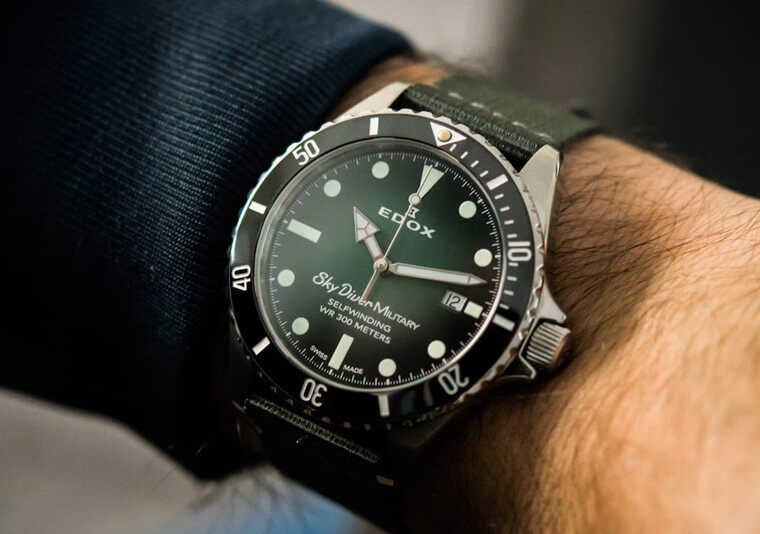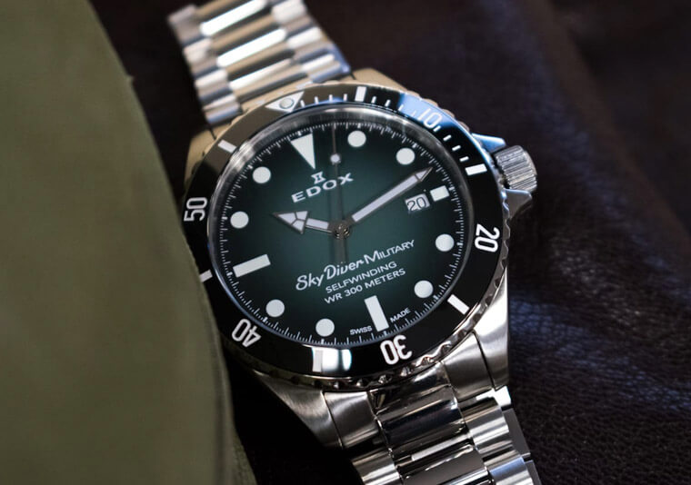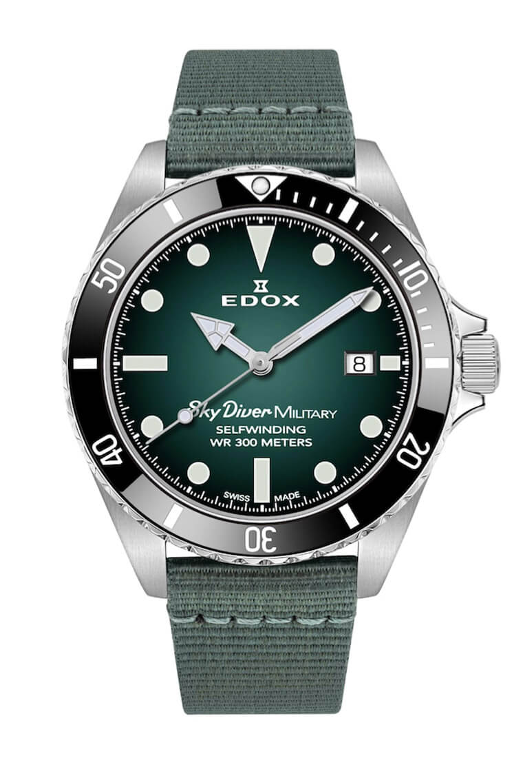 然而时间过了这麼久,上校的禁令已经随着时间演进而失效,这倒提供了EDOX一个很好的制表灵感,促成品牌开发出这款带有军表色彩的复刻手表。表款採用不锈钢材质制作,表径42mm符合现在运动表市场追求的主流尺寸,而它的单向旋转表圈除了可以用来计算下潜时间,还是使用陶瓷材质打造,这让佩戴者平常比较不需要担心表圈刮伤的问题,另外它的蓝宝石水晶镜面厚度有2mm,为的也就是提供手表更加的保护效果,再加上300米的防水性能,让SkyDiver成为一款就算让现代军人佩戴出任务也能胜任的时计。