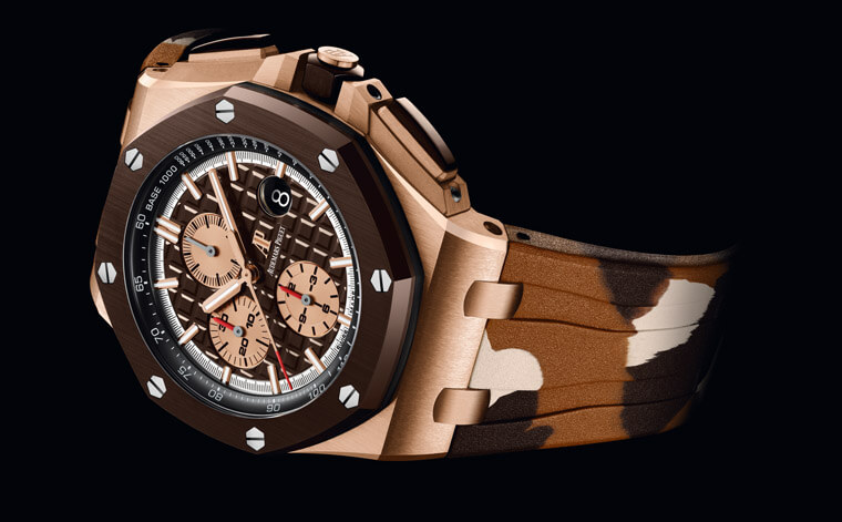 目前线上的44mm ROO计时码表以配置橡胶表带为主(少部分款式则是使用鱷鱼皮表带),但是橡胶带顏色大概也就是黑色与白色这些万年不败的选项,然而这款44mm ROO计时码表不一样,继2018年之后,爱彼再度延续迷彩表带的话题度,棕色迷彩和棕色陶瓷圈的搭配一反绿色调丛林迷彩的个性,展现出另一种沙漠迷彩的味道,结合离岸型原本就比较阳刚的风格,让爱彼的手表更能打入年轻族群之中。