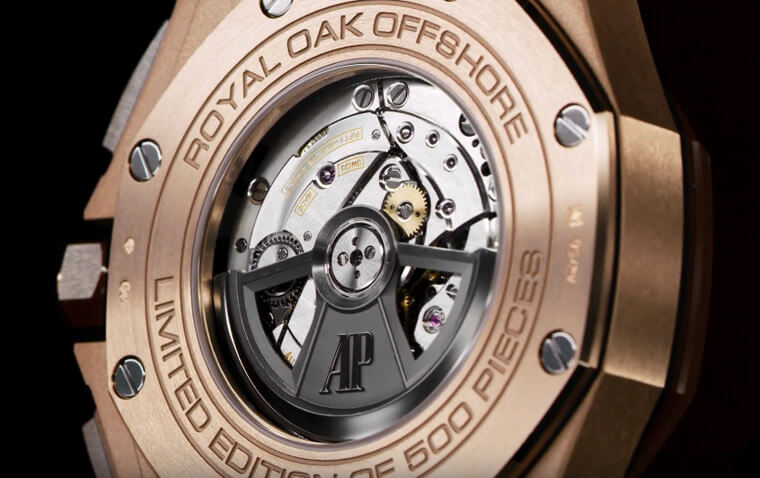 表款搭载的3126/3840机芯是在爱彼的3120机芯加上计时模组之后所形成,它具备左三眼的小表盘样式虽然不是什麼新奇设计,但有一点比较特别之处是在于小秒盘位于12点方向,这有别于我们一般见到左三眼设计的小秒盘位置。44mm版本机芯的自动盘两边都有镂空,中间只简单刻上"AP"两个字,自动盘表面还经过镀黑处理,相比之下42mm自动盘是实心并露出K金原色,上面还刻有爱彼家徽这类的装饰图腾,以视觉感受来说,44mm更符合运动表的基本印象。