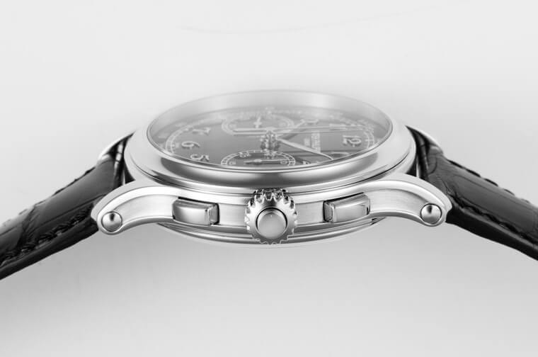 ▲表耳与按把线条均相当流丽圆滑,表耳侧边多了装饰的圆形螺帽,呼应珐琅面盘的温和光泽,追针强烈的速度感顿时被软化不少,更为含蓄内敛。
