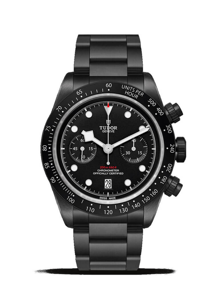第一眼看到这款全黑的外观时,心裡会一惊想说难道继Fastrider Black Shield之后,帝舵又把陶瓷表壳移植到Black Bay系列上了吗,其实不然,别忘了Black Bay原本就有lack Bay Dark三针款,这款和三针款的全黑表壳同样是经过全黑镀层处理,手表採用特色鲜明的磨砂钢链带,呈现雾面效果,饰以经过物理气相沉积工艺处理的全黑色镀层,因此它只是外观看起来有点陶瓷表壳的味道,但是在硬度方面,当然还是Fastrider Black Shield略胜一筹。