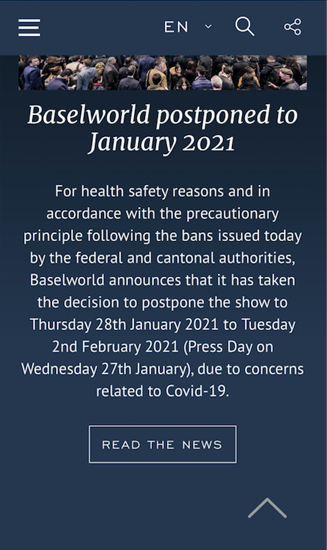 1917年成立至今已超过一百年的巴塞尔钟表展,每年吸引超过80,000名来自全球各地钟表厂商、买家以及爱好者,面对这次前所未有的突发状况,以积极配合的态度面对与协调,公告中也载明2021年巴塞尔钟表珠宝展将会由3月提前至1月28日至2月2日之间举行,其他细节看后续情况发展如何再议。