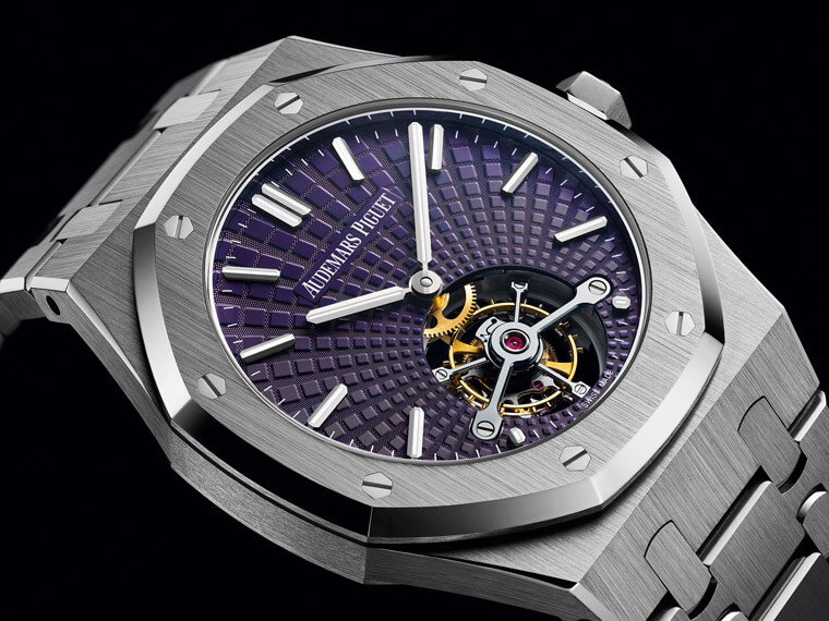 前几年AP推出新版RO超薄陀飞轮,这批新款除了加入了若干新潮的配色和宝石镶嵌,更本质性的修改是它们将皇家橡树经典的格纹面盘由纵横垂直交错的方正样式改成了以6点钟陀飞轮为中心向外放射的构图。短短数年间新式的设计快速地普及到整条产品线,目前仍然採用传统方格纹路的在品牌官网上只剩下一只蓝面玫瑰金款、一只不锈钢蓝面款和另一只喷砂烟燻蓝面钛金属款,而採用新面盘的款式中只有紫面等少数款式为不锈钢壳,蓝面这种过去以为再理所当然不过的基本组合如今已经不能算是这系列陀飞轮的主力顏色了。