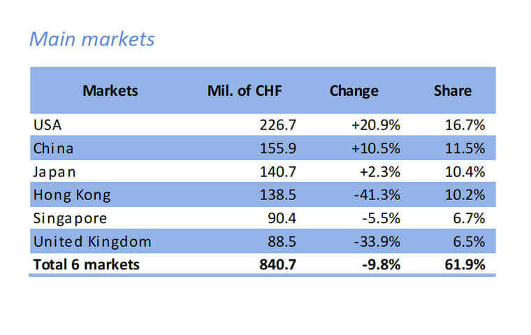 ▲截至2020年3月,瑞士錶全球六大市場的表現如上圖所示,其中美國占瑞士錶出口額總數的16.7%,是目前瑞士錶最主要的出口市場。圖片:fhs.swiss
