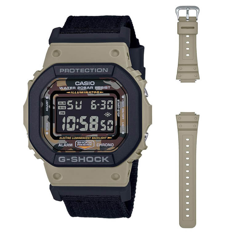 DW-5610SU與DW-5610SUS皆以G-SHOCK經典的5600系列為基礎,並首度採用雙層錶圈設計,相較以往使用一體成形與同色系的錶殼,DW-5610SU與DW-5610SUS的撞色效果讓人耳目一新。其中DW-5610SU分別有黑錶圈搭配綠或灰色錶殼和錶帶,而DW-5610SUS則採黑色錶圈搭配淺棕色錶殼與黑色帆布錶帶,並以沙漠迷彩點綴於錶面,這款還會另外附上一組橡膠錶帶可供替換。