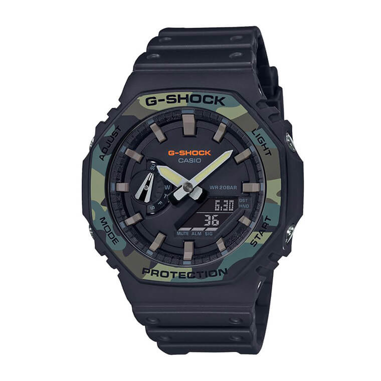 農家橡樹剛推出時配色還不算多,其中全黑款式的1A1更是市場上搶翻天的人氣寵兒,然而隨著街頭軍事系列登場,G-SHOCK無疑又替市場帶來更多引人矚目的搶眼配色可以挑選。除了GA-2100SU改換採用雙層錶圈設計,以綠色迷彩錶圈搭配黑色錶殼和錶帶之外,品牌甚至還延伸出GA-2110SU型號,這款分別有黑色錶圈搭配黃色或是綠色錶殼和錶帶,打破1A1的黑色神話,用更具冒險風格的配色賦予農家橡樹同樣潮味十足的外觀。農家橡樹除了外型搶眼之外,它的機能性也不在話下,包括防水200米、世界時間、計時碼錶、鬧鈴等功能一應俱全,與GA-2000系列同為指針加上數位顯示的方式也提供手錶不一樣的閱讀感受。