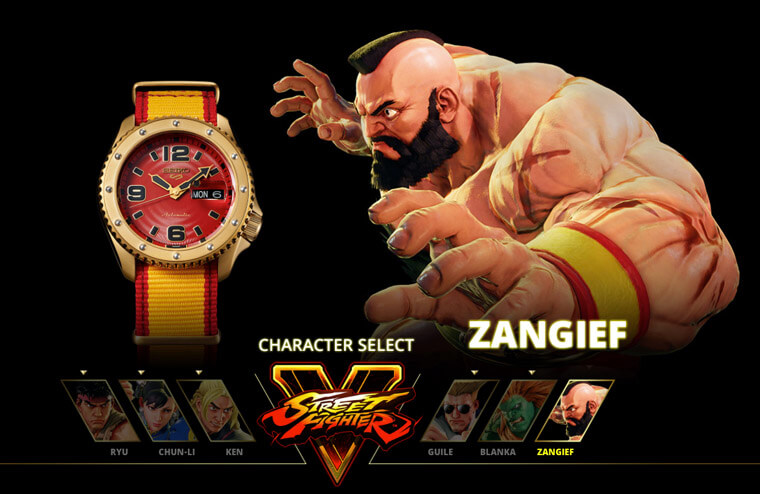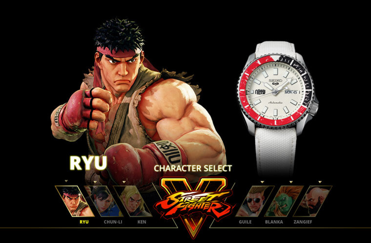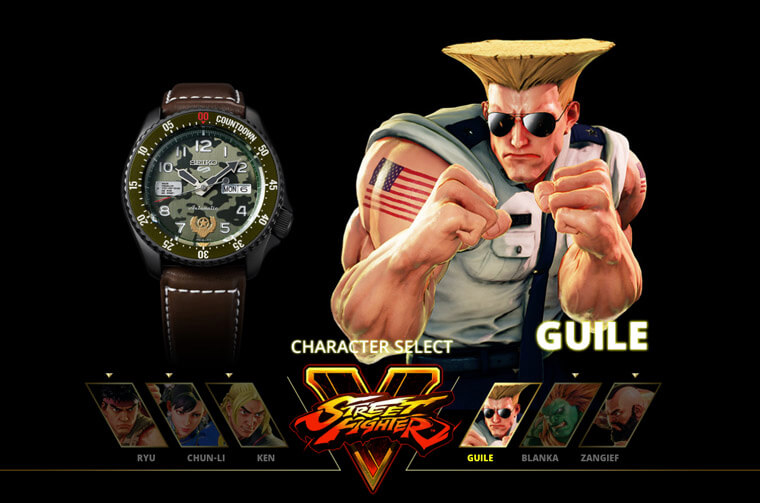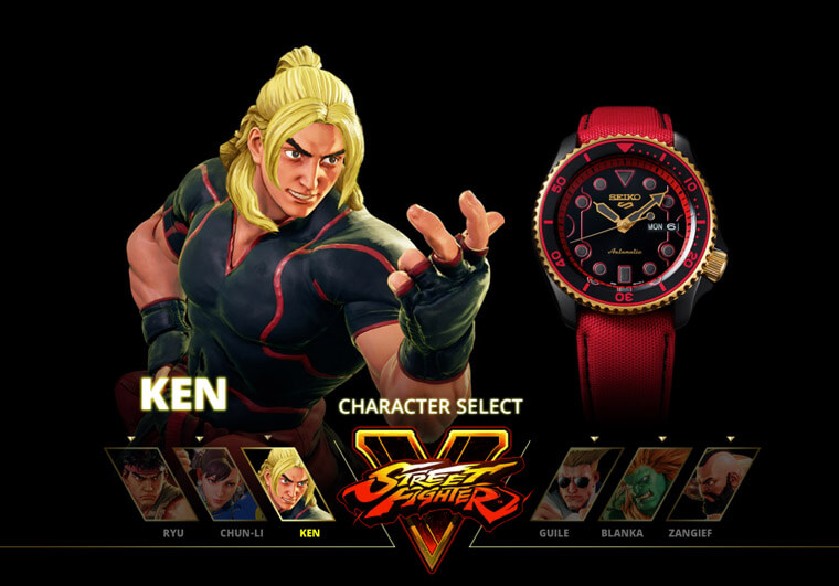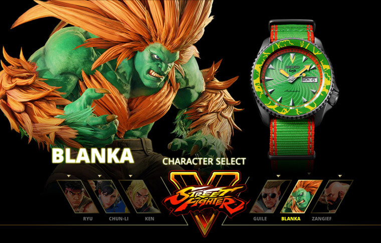 問題來了,快打旋風的角色有很多位,這次5 Sports系列會選擇哪幾位人物作為設計靈感呢?其實並不難猜,因為SEIKO選的都是一些耳熟能詳的主要角色,包括隆、肯、春麗、美國大兵凱爾、桑吉爾夫以及「怪獸」布蘭卡等共六位人氣人物。