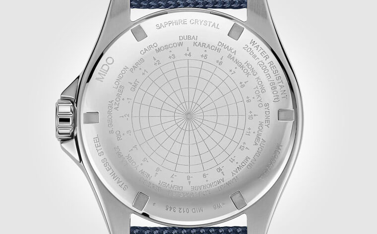 翻至錶背,實底蓋上刻有世界24個時區的代表城市名稱及各自與格林威治平均時間相距的時差,底蓋下保護的是錶款的心臟──Caliber 80自動機芯,如今這枚機芯廣泛運用在品牌作品之中,出廠前均經過3方位調校確保腕錶的精準度足以令人放心,且以入門自動錶而言,錶款的動力儲存具備超過3日鍊的水準相當優渥。