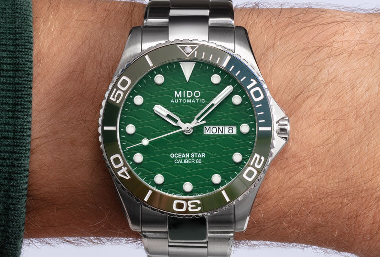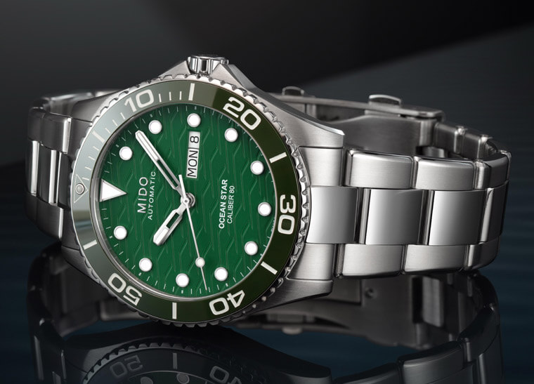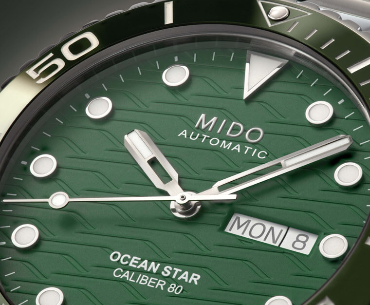 錶圈的變化一路延續近面盤,海洋之星200米陶瓷圈手錶雖同樣是大三針加上3點方向設有日期與星期顯示,但首先它的面盤已從舊款的拉絲處理改為能與系列淵源呼應的波浪刻紋,美度表進一步在藍面、灰面等常見面盤顏色之外嶄新推出系列首見的湖水綠面盤。綠面潛水錶近年蔚為流行,如今海洋之星也趕上了這股潮流,以令人耳目一新的綠面提供市場更多元的選擇。海洋之星200米陶瓷圈手錶除了面盤搶眼的波浪紋之外,包括它的時標與秒針樣式也都和海洋之星領航80小時潛水錶有所區隔,前者改成圓點時標(僅12點方向為倒三角形時標),同時秒針指尖也改為棒棒糖針,這些皆與舊款的矩形時標搭配箭頭秒針有所異同。