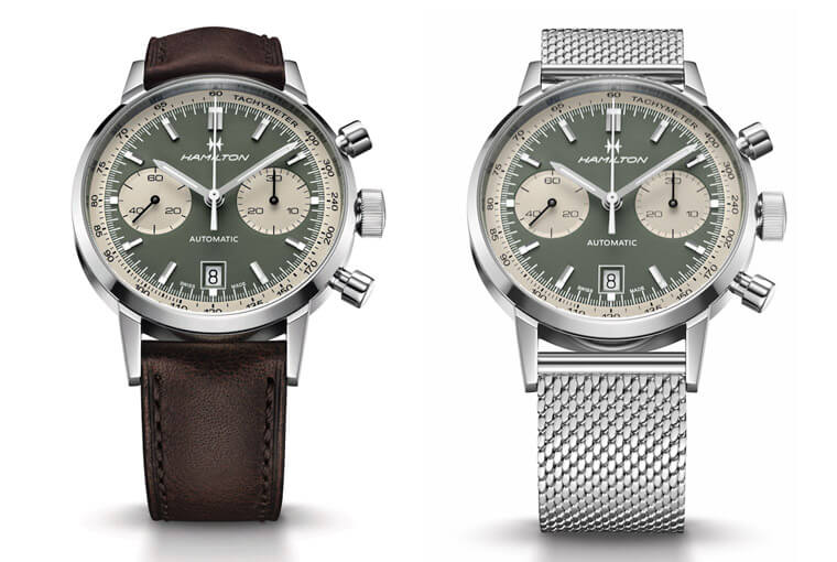 前幾年以熊貓面梗吸引錶迷目光的Intra-Matic計時碼錶2021年改搭手上鍊機芯登場,除了有系列深受歡迎的熊貓面與反熊貓面配色(搭配皮帶或米蘭鍊帶),漢米爾頓還新增了綠白雙色面盤,以更具視覺渲染力的樣貌,展現以早期手錶為靈感的時代美學。