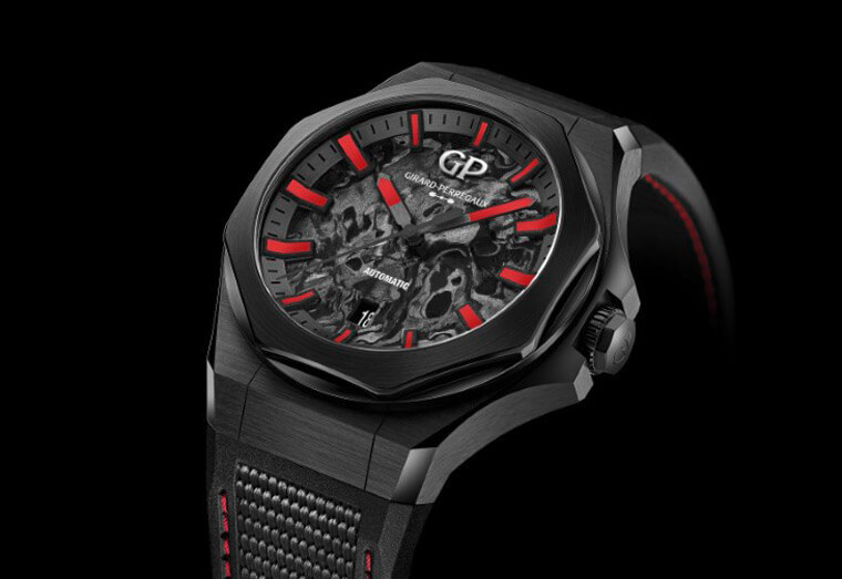 GP這次替錶款採用的PVD鈦金屬錶殼和品牌之前推出的Laureato Absolute無異,鍍上黑色的鈦金屬顯得更有個性甚至帶點潮味,同時這種材質的輕量化特性也讓佩戴者可以獲得更舒適的感受。Laureato系列外觀的特徵不用多說自然就是它的八角形錶圈,加上錶殼的圓形線條交織出多層次的幾何造型。這款Laureato Absolute赤焰之光手錶也持續搭配一體式的黑色橡膠錶帶,不過其兩邊縫線已經改為紅色,藉以呼應面盤的細節亮點。
