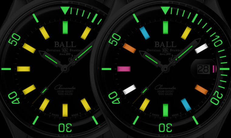 BALL WATCH有項招牌製錶科技就在於他們的微型氣燈,這點對潛水錶而言尤其重要,Engineer Master II Diver Chronometer內置式潛水錶圈的刻度便是鑲上了微型氣燈,另外小時時標以及指針上也都有微型氣燈,這讓佩戴者於水下昏暗的環境依舊能夠看得清楚時間,有別於一般採用的夜光物料,BALL WATCH的微型氣燈不但能自體發光,亮度亦更為持久。