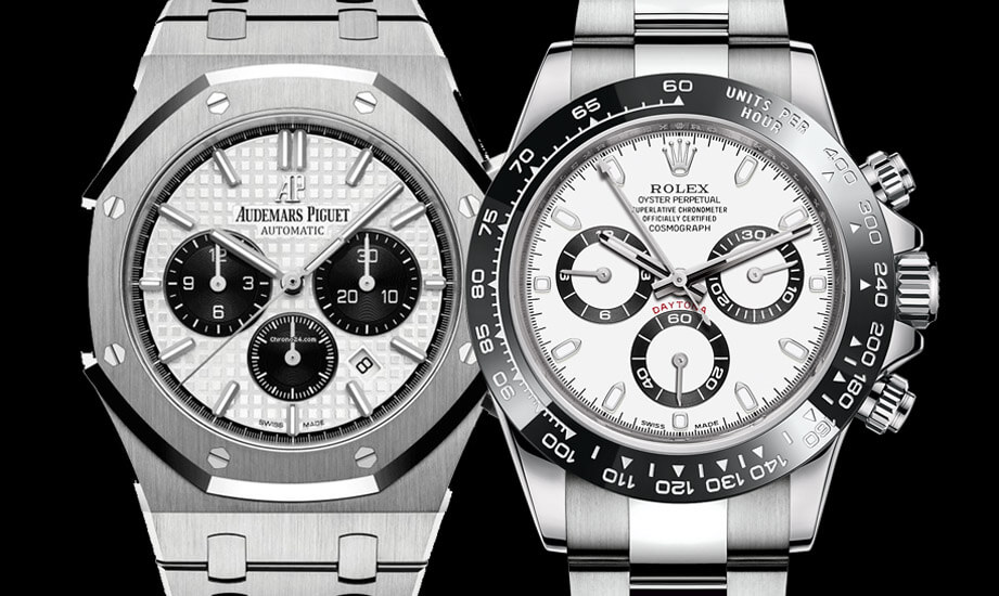 不鏽鋼錶殼的AP皇家橡樹計時碼錶和勞力士Daytona原本因為各自的品牌定位而在價格方面有一段落差,如前者定價約70幾萬、後者則是40幾萬,因此通常我們比較不會將兩款放在同個起跑點;但是時代不一樣了,Daytona搶手的程度愈來愈誇張,雖然皇家橡樹本身也是一款熱門錶,但是Daytona先前最受歡迎的鋼殼熊貓面116500LN已經有喊價到120萬左右的情況,比起41mm鋼殼的皇家橡樹計時碼錶26331ST目前行情大概130~140萬也差不了多少。