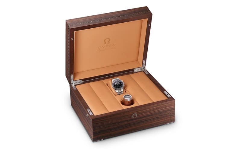 對於打算入手這款錶的人,歐米茄專程製作了65週年紀念木質錶盒,它的造型源自初代超霸手錶的錶盒,材質則是選用高級木材鵝掌楸(外觀類似花梨木),光是錶殼的質感就能讓人先一步感受到手錶的獨特紀念意義。