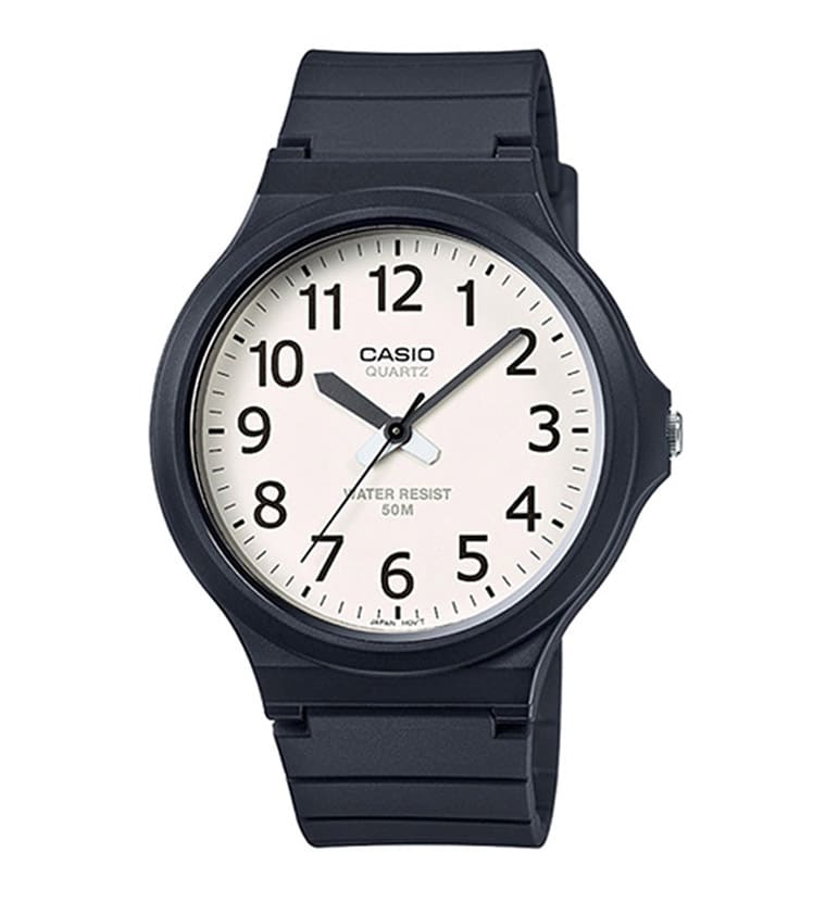MW-240-7BJF的三針功能顯得非常純粹簡約,米白色面盤搭配黑色時標和指針,高對比感看時間一請二楚。不過它的防水性相對來說也比較普通,只有50米,不過像是這種黑白配的顏色,其實搭配上也滿萬用的。參考價:NT$ 685