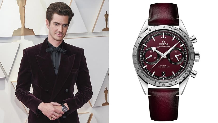 二代蜘蛛人安德魯加菲爾德繼新款Aqua Terra 38mm後,再度於奧斯卡獎搶先佩戴新款的Speedmaster '57手錶,他特別選擇酒紅色面盤與自己的紅色天鵝絨西裝搭配。Source:Robbreport
