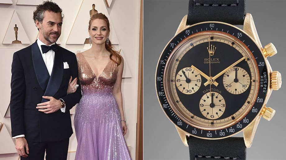 本屆奧斯卡獎最佳女主角潔西卡雀絲坦的老公Gian Luca Passi de Preposulo雖然風采沒有老婆強,但是他戴的勞力士古董Daytona可就厲害了,那可是身價驚人的Paul Newman "John Player Special"版本。Source:Robbreport
