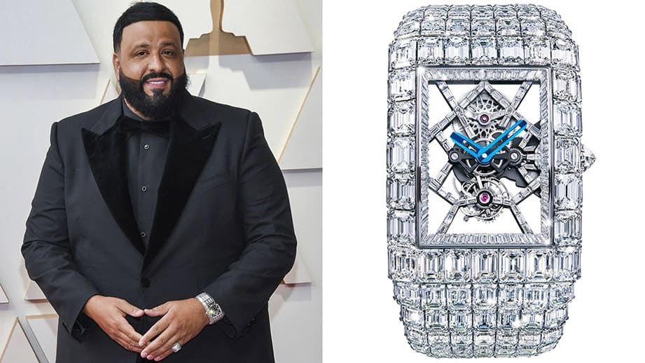 DJ Khaled穿著整身的黑西裝搭配黑襯衫看似低調,但是手錶的滿天星鑽石重約189克拉可就不同凡響,閃亮亮的鑽石讓手錶的鏤空結構稍微有點失色,但手錶整體造型還是非常搶鏡。Source:Robbreport