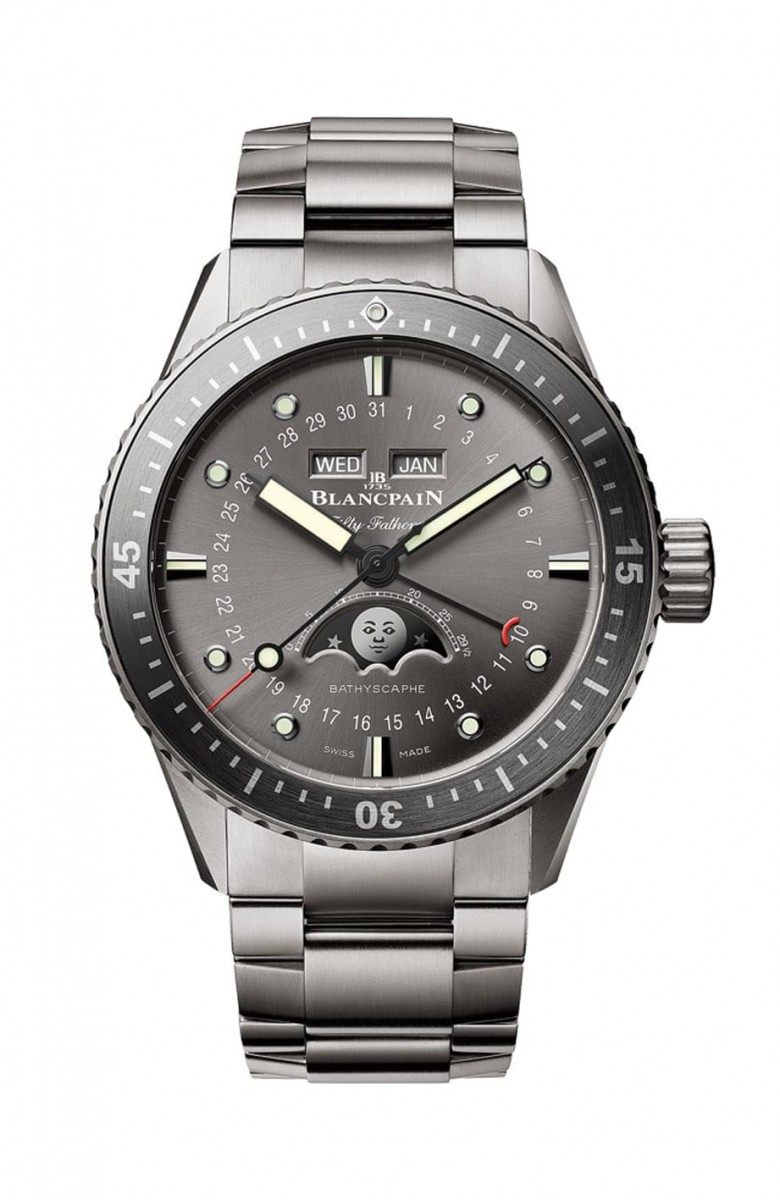 五十噚深潛器全日曆月相腕錶,採用緞面打磨碳灰色陶瓷單向旋轉錶圈,內嵌Liquidmetal™時間刻度,錶底與錶殼同樣採鈦金屬材質製成,並設有潛水錶罕見的全日曆月相功能,這款錶也是深潛器型號中首度採用23級鈦金屬的新嘗試。