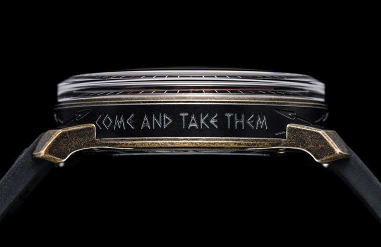 ▲錶殼兩側刻有溫泉關戰役時斯巴達國王的經典名句,突顯手錶創作主題。