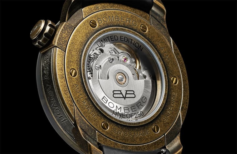 錶背在透明底蓋邊緣仍是經過舊化處理的銅色不鏽鋼材質,底蓋下方露出炸彈錶選用的SW200自動上鍊機芯,這枚通用機芯有不少知名品牌也在使用,品質久經市場淬煉,動力儲存38小時雖然不如現代一堆長動能機芯,不過如果平日都有代表習慣,自動上鍊機制已經足以確保手錶處於動能充沛的情況。