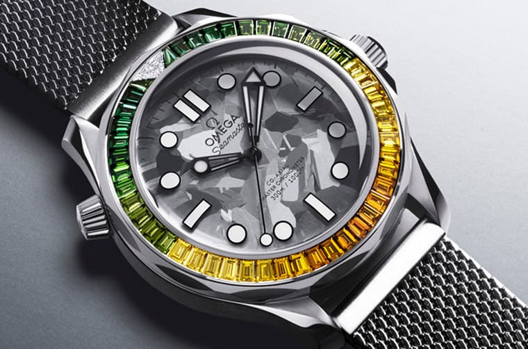 另一款龐德電影60週年紀念錶以歐米茄獨家的貴金屬Canopus Gold™金製成,而且它明顯與一般版的海馬潛水300米很不一樣,關鍵便在於錶圈鑲滿了彩色寶石,使得手錶外觀既華麗又貴氣,的確很有紀念錶的氣勢。