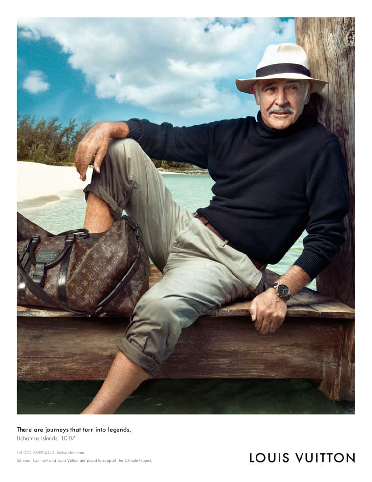 ▲已逝影星史恩康納萊2008年為路易威登代言,在巴哈馬群島海邊帶著經典keepall提袋,手腕上則是天文台認證的Tambour LV277 計時碼錶。