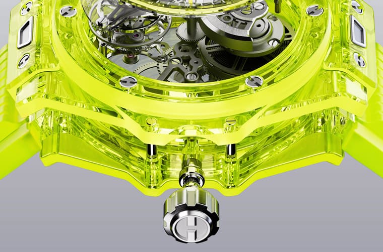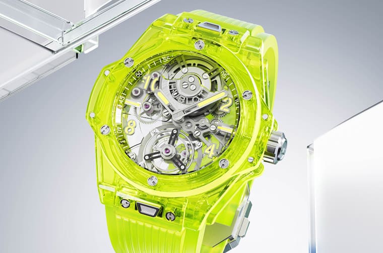 宇舶繼2019年推出採用綠色透明錶殼的Big Bang MP-11 SAXEM手錶後,2023年另於Big Bang陀飛輪採用同為錶壇首見的SAXEM螢光黃透明錶殼,持續鞏固品牌研發彩色透明錶殼的領先地位。錶款運用來自航太工業的特殊材質——SAXEM打造44mm錶殼,搭載近年品牌曝光度頗高的HUB6035自動陀飛輪鏤空機芯,面盤上12點與6點方向依序有前置微型自動盤與陀飛輪兩相對應,另外時標與指針上的夜光物料也因應錶殼顏色而改換成淺黃色,機芯擁有72小時動力儲存,搭配手錶達30米的防水性能,這些紮實規格在大膽明豔的螢光黃色系透明錶殼包覆下大大強化了手錶的視覺魅力。