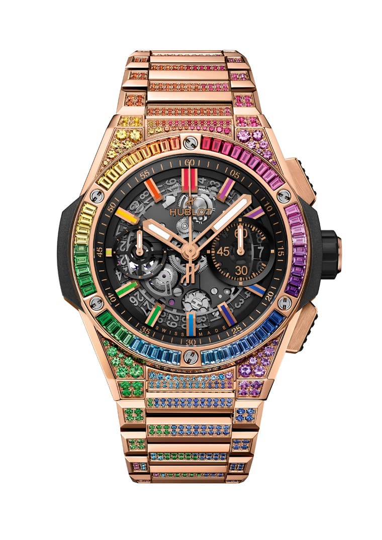 18K皇金材質/HUB1280 UNICO自動上錬機芯/時、分、小秒、日期顯示/計時碼錶功能/錶殼鑲彩色寶石120顆/錶圈鑲長方形切割彩色寶石54顆/鍊帶與錶扣鑲彩色寶石768顆/藍寶石水晶鏡面、透明底蓋/防水100米/錶徑42mm/參考價:NT$ 5,232,000
