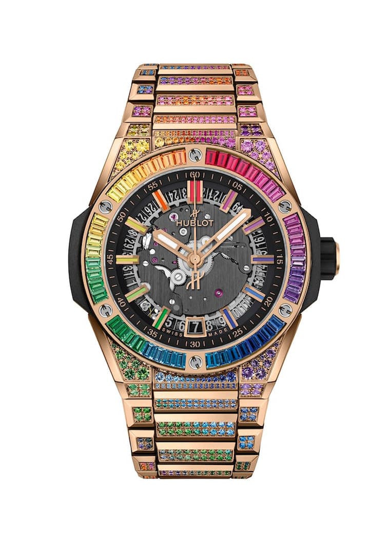 18K皇金材質/HUB1710自動上錬機芯/時、分、秒、日期顯示/錶殼鑲彩色寶石128顆/錶圈鑲長方形切割彩色寶石48顆/鍊帶與錶扣鑲彩色寶石748顆/藍寶石水晶鏡面、透明底蓋/防水100米/錶徑40mm/參考價:NT$ 4,905,000