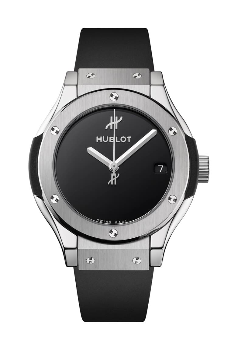 鈦金屬或黑色陶瓷或18K黃金材質/HUB1110自動上錬機芯/時、分、秒、日期顯示/藍寶石水晶鏡面、透明底蓋/防水50米/錶徑42mm/參考價:NT$ 256,000(鈦金屬)、NT$ 311,000(黑色陶瓷)、NT$ 749,000(黃金)