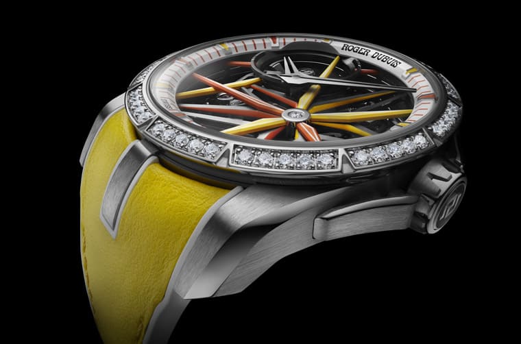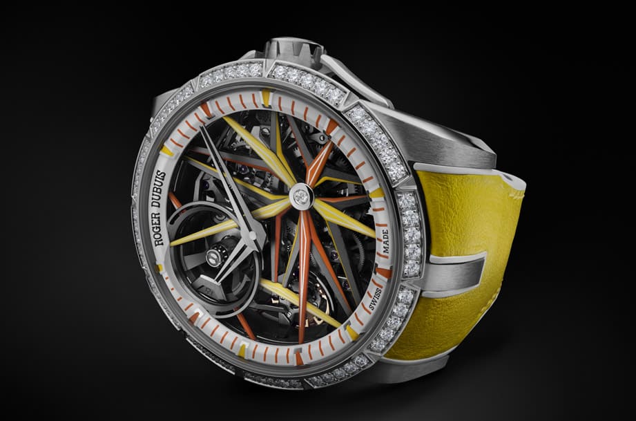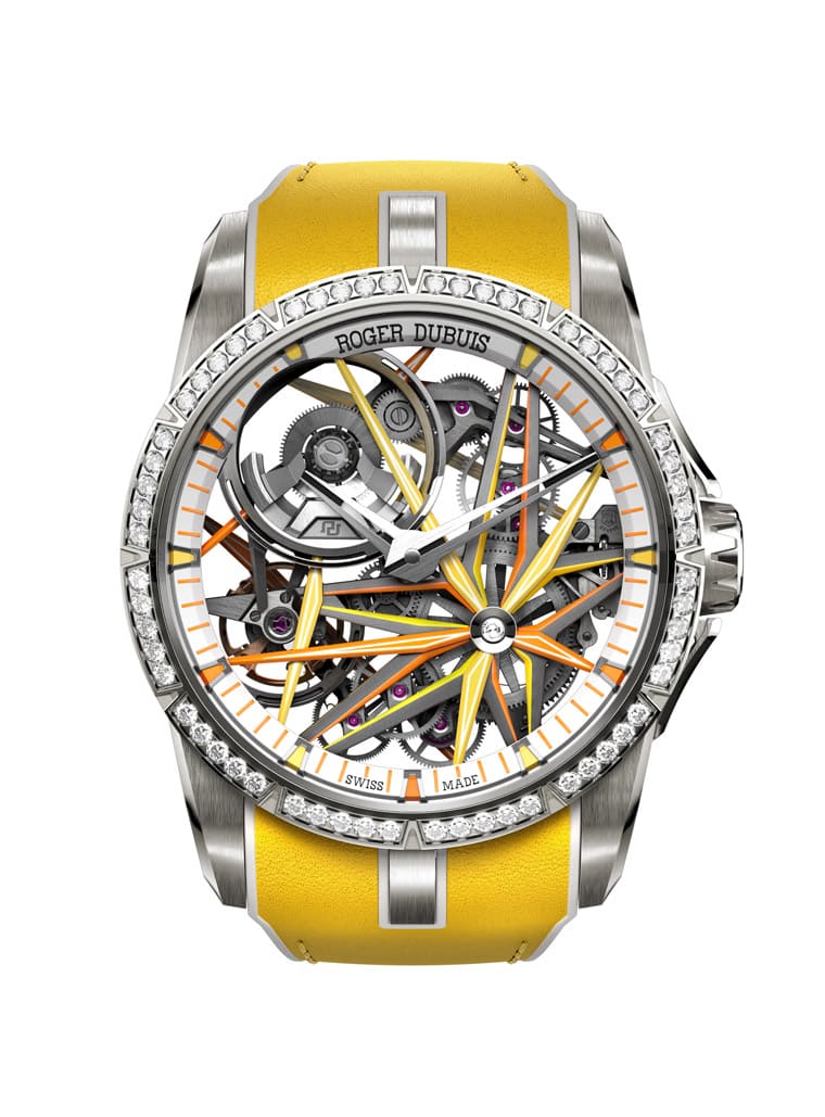 ▲羅杰杜彼新作Excalibur Blacklight Monobalancier採用白金材質,錶圈鑲上美鑽並搭配亮黃色皮錶帶,讓人第一眼就很驚豔。