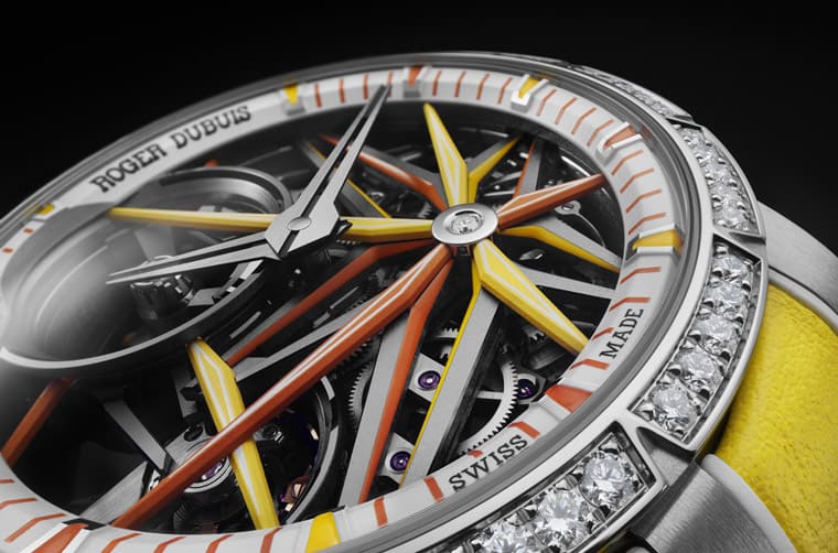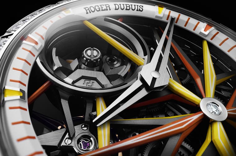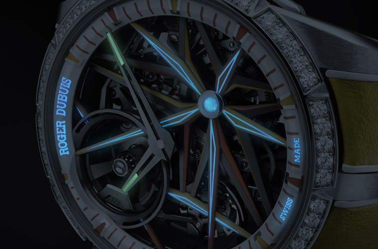 錶款面盤依舊以羅杰杜彼擅長的鏤空工藝呈現,包括機芯的前置微型自動盤、發條盒、走時輪系等都可以看得很清楚,至於品牌著名的星形造型橋板更是不可或缺的元素,而這款錶還重新設計過機芯零件,使得橋板呈現出立體感,此微型結構在白天會呈現亮黃色與橘色與錶帶和時標的UV塗料呼應,在紫外燈照射下又會展現出其隱藏的螢光和閃射霓虹光彩,而且注意看星形橋板軸心,也就是發條盒軸心部位還精心鑲上一顆鑽石,使得機芯內部也可以反射出迷人光芒,而且就連面盤上下緣的羅杰杜彼字樣與”SWISS MADE”字樣也同樣會在紫外燈照射下發出螢光,而時、分指針前端的螢光偏向綠色,與前述其他零件的藍色螢光有別。